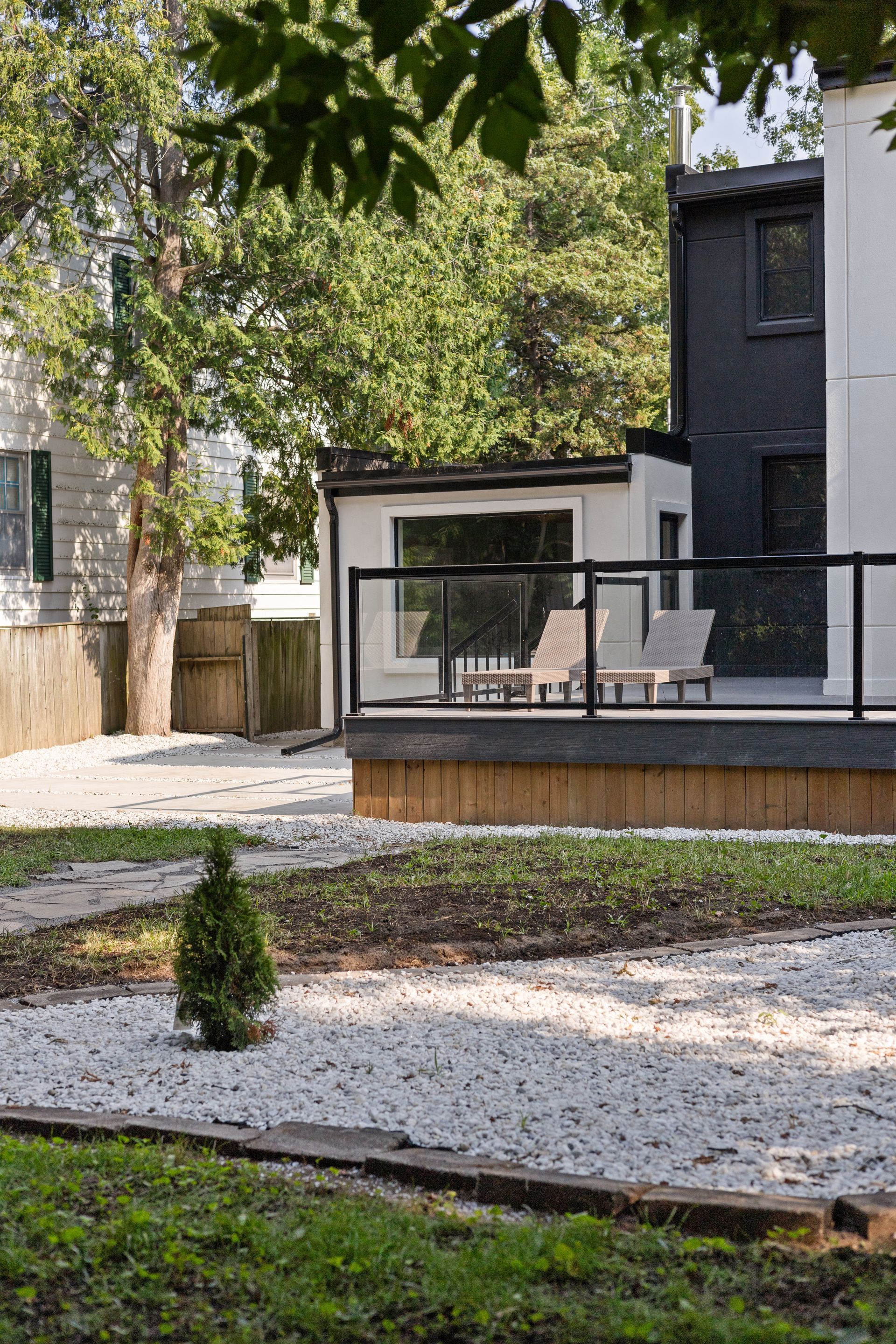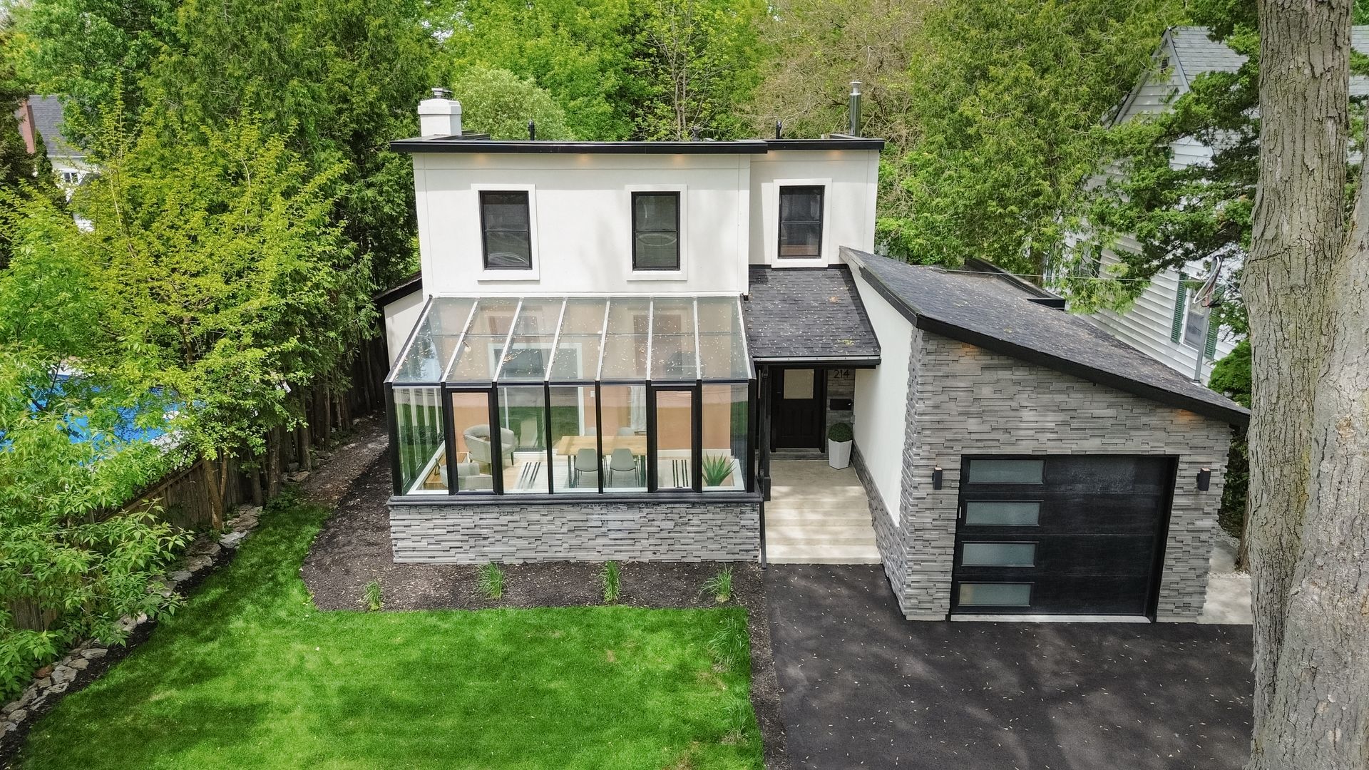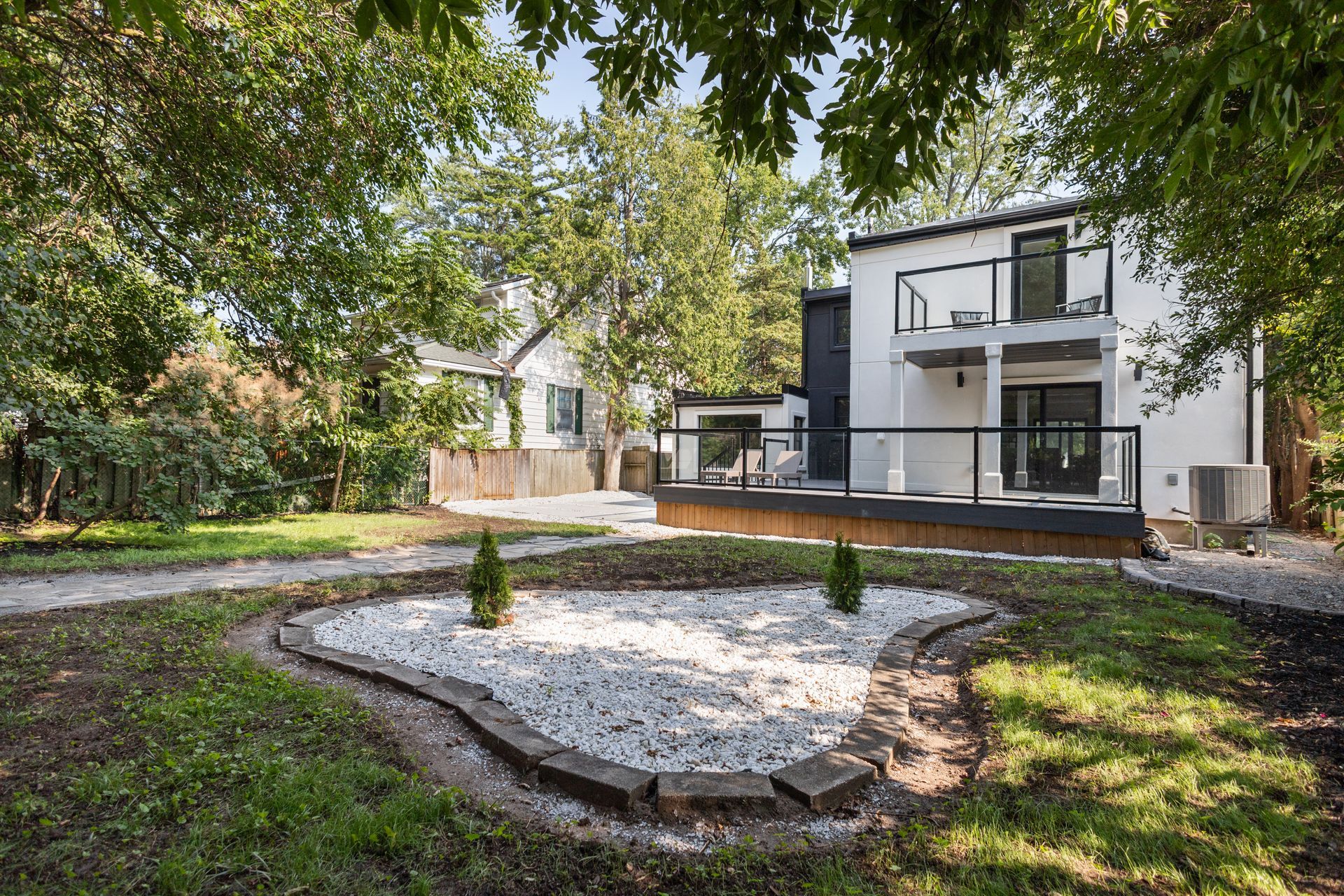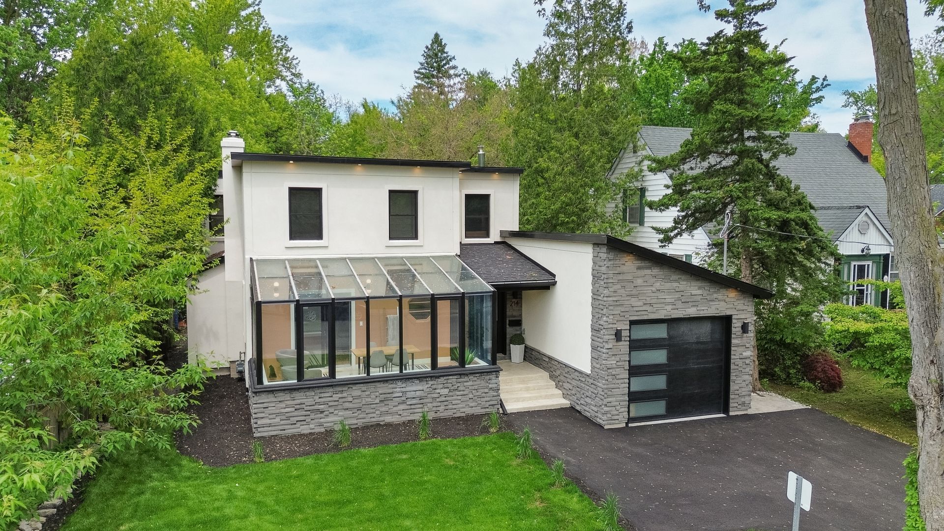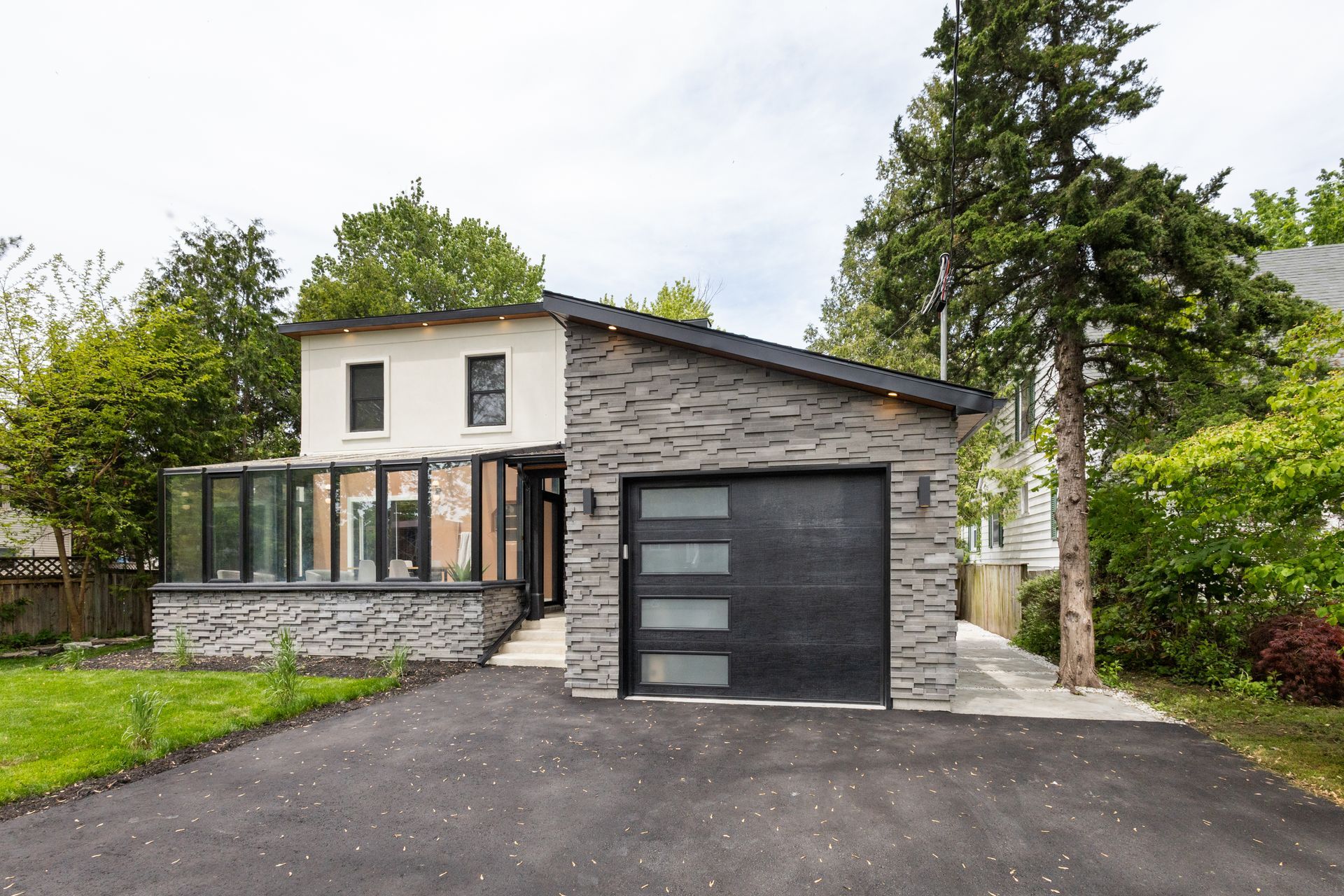 Stunning modern architectural home in the heart of Old East Hill, set on a private 175+ ft lot. Completely reimagined and thoughtfully renovated, this one-of-a-kind residence offers 3 bedrooms, 3.5 bathrooms, and multiple spaces designed for everyday living and entertaining. The striking stone and stucco exterior, attached garage, covered porch, and solarium create a bold first impression. Inside, the spacious kitchen steps down to a sunken living room with exposed beams, a gas fireplace, and oversized rear-facing windows that bring the outdoors in. A 2-piece bath and convenient laundry area are tucked away en route to the open-concept living and dining area featuring modern lighting, a second gas fireplace, a wet bar, and access to the expansive composite deck with glass railings. Upstairs, all three bedrooms are paired with full bathrooms for ultimate convenience. The primary suite includes a walk-in closet, feature wall with sconce lighting, and a walkout to a private terrace overlooking the park-like backyard. Additional outdoor highlights include a lower-level concrete patio and steps wrapping around the east side. Situated in one of Belleville’s most sought-after neighbourhoods, this home stands out for its design, finishes, and exceptional setting.